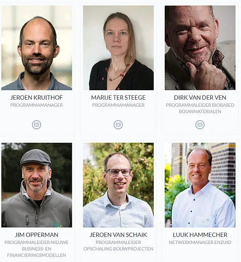 Als programmanagers zijn vanuit TNO Jeroen Kruithof en Marije ter Steege begonnen. Voor de programmalijnen op de schaal van Zuid-Nederland zijn de programmaleiders uit de regio's benoemd: Dirk van de Ven vanuit REWIN voor Biobased bouwen, Jim Opperman vanuit Midpoint Brabant voor nieuwe businessmodellen en Jeroen van Schaik vanuit Impuls Zeeland voor opschaling bouwprojecten. Op korte termijn wordt vanuit Limburg nog de programmaleider voor grondstoffen en materialenhubs benoemd.